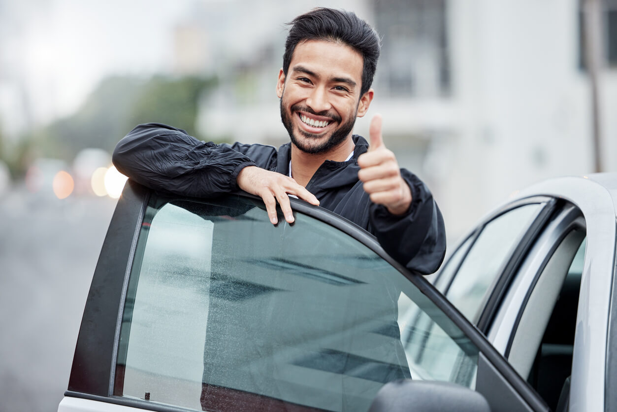 A male driver is standing with his arm resting on the driver’s door, smiling and giving a thumbs up after his CDL medical exams.